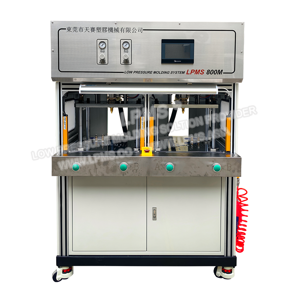 LPMS 800頂式低壓注膠機的工作臺和熔膠系統為一體式設計,其注膠槍位於模具上方,從模具頂部注膠,此結構可讓一模多穴的模具流道排布更均勻、縮短流道長度、節省膠料,適合封裝較小的產品或線束、串燈類產品。