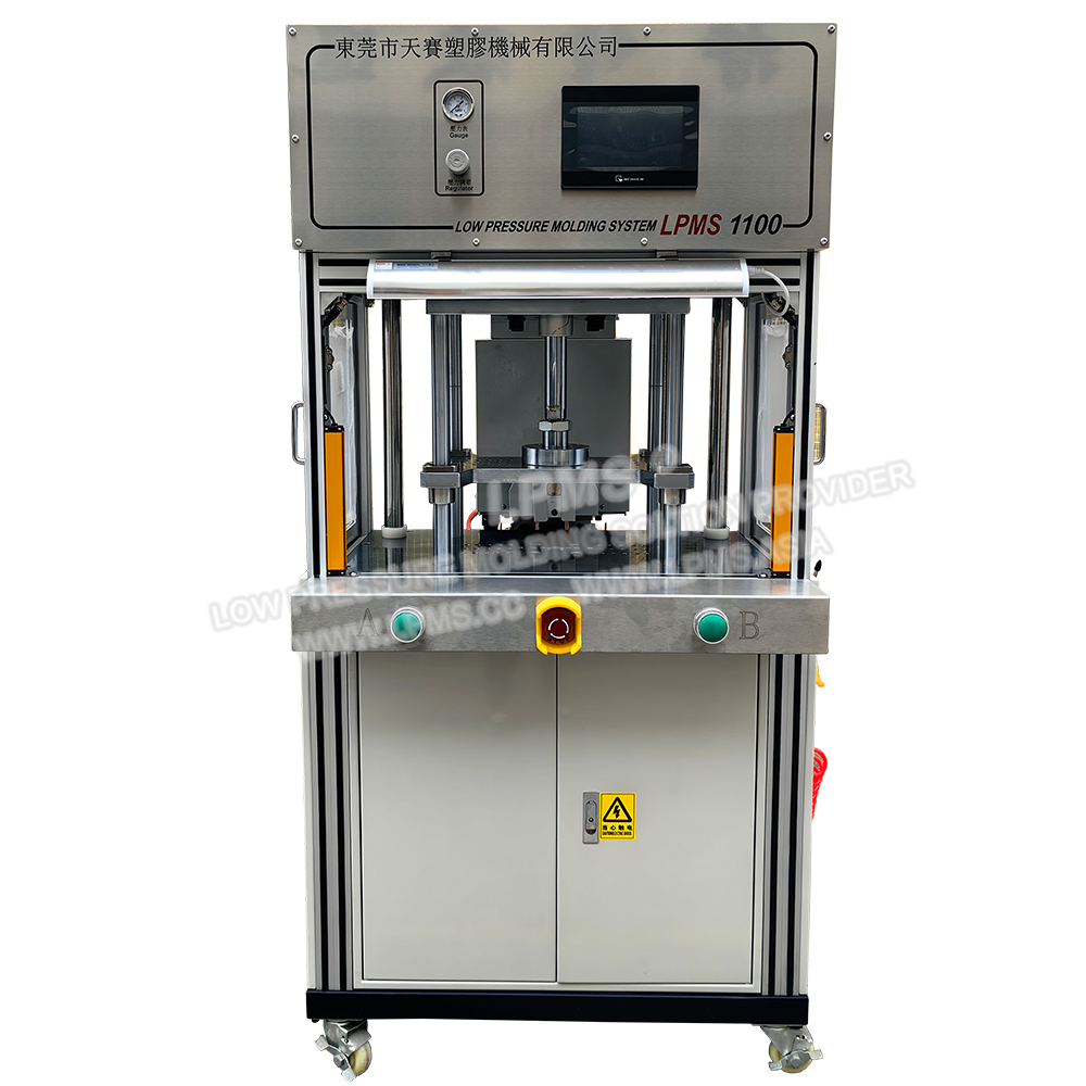 LPMS 300桌上型側式低壓注膠機的工作臺和熔膠系統為一體式設計,其注膠槍位於模具側面,從模具側面注膠,當產品較大時模具只能設計為一模一穴,採用側式低壓注膠可避免在產品正上方注膠而留下進料痕影響產品美觀。適合封裝尺寸較大或外形複雜產品。