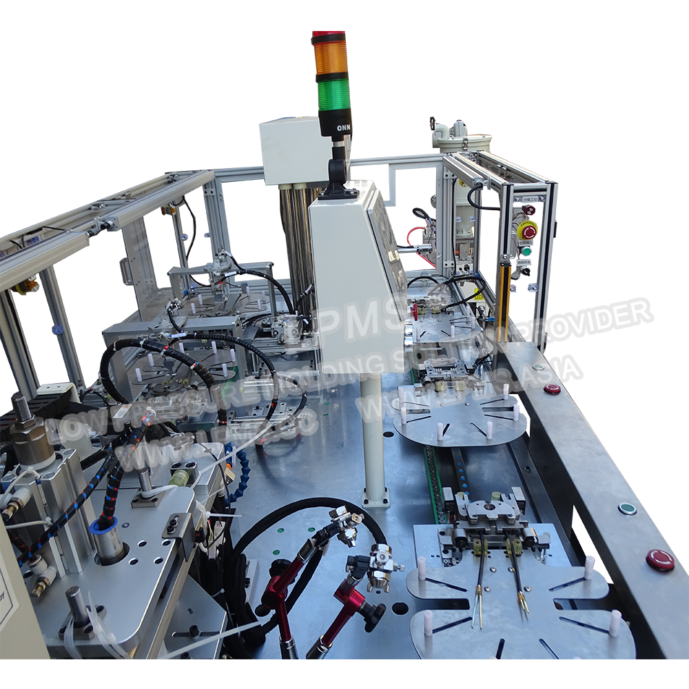 l 該環形軌道式自動低壓注塑機,環形軌道上均布8個工位(工位數量可根據產品工序增加或減少),2個工位放線擺線,其他工位自動工作(CCD檢測、合上模,低壓注膠,開線夾,開上模,頂出取水口,取成品).