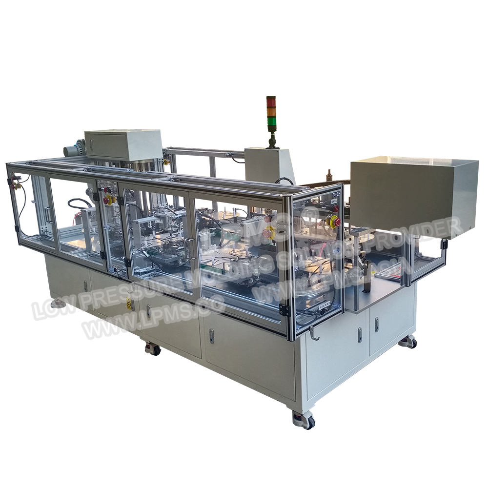 環形軌道式自動低壓注塑, 整機8個工位,對應8套模具,8套模具由環形軌道帶動作類似於圓周運動來完成各工序的自動化生產,設備自動化程式高,生產效率高.