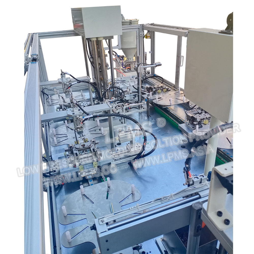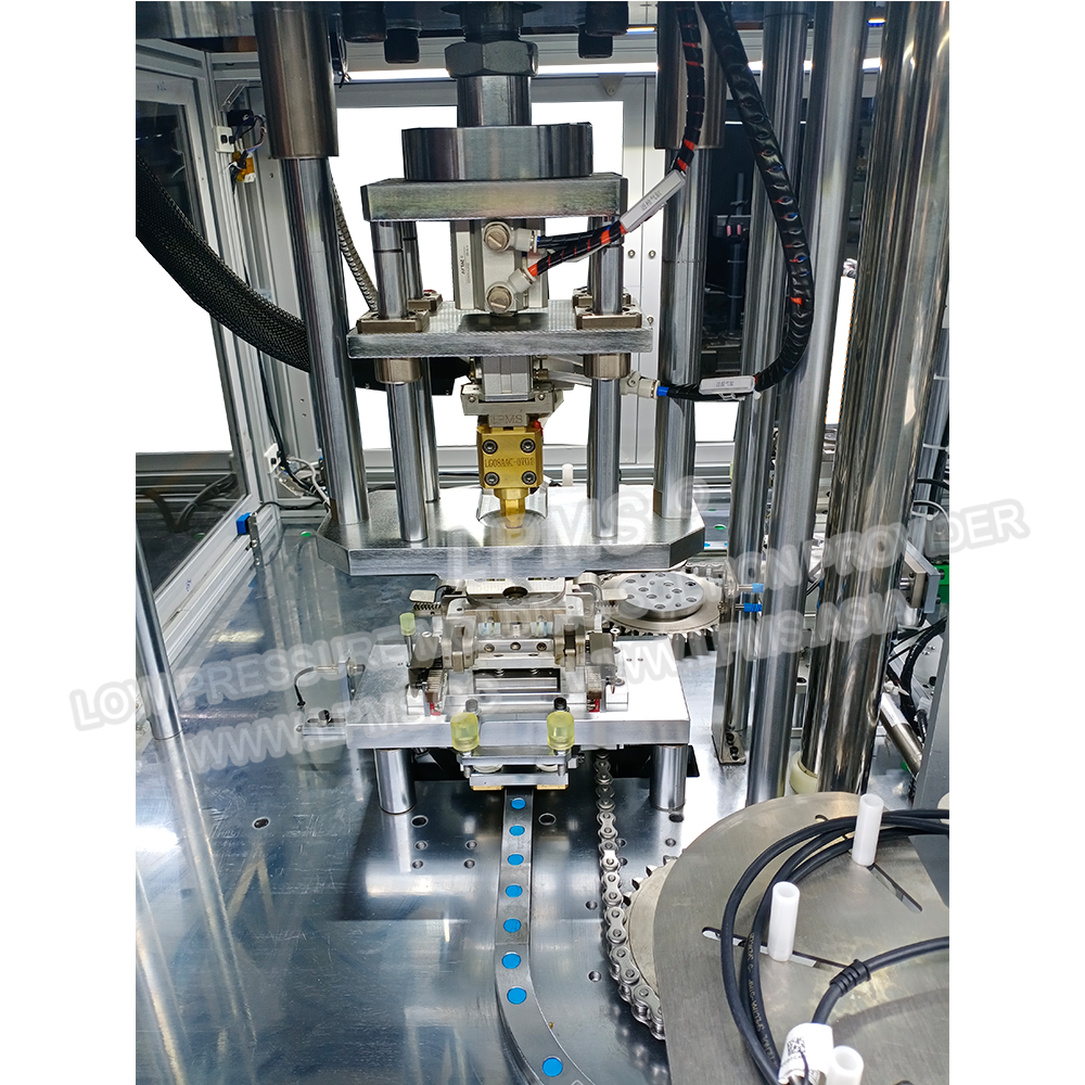 環(huán)形軌道式自動低壓注塑, 整機8個工位,對應(yīng)8套模具,8套模具由環(huán)形軌道帶動類似于圓周運動來完成各工序的自動化生產(chǎn),設(shè)備自動化程序高,生產(chǎn)效率高.